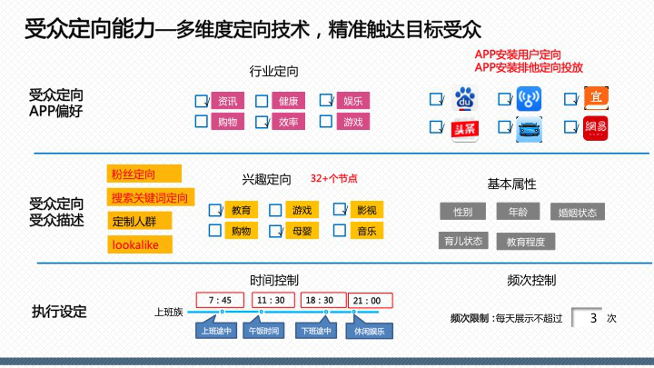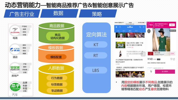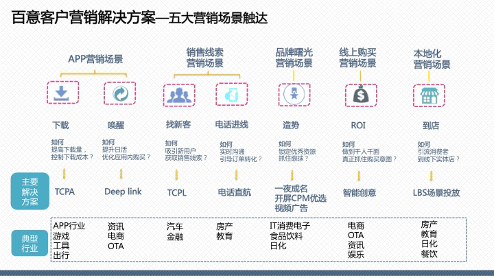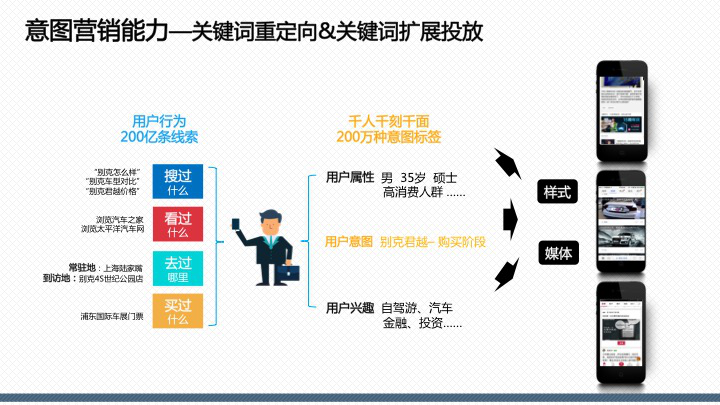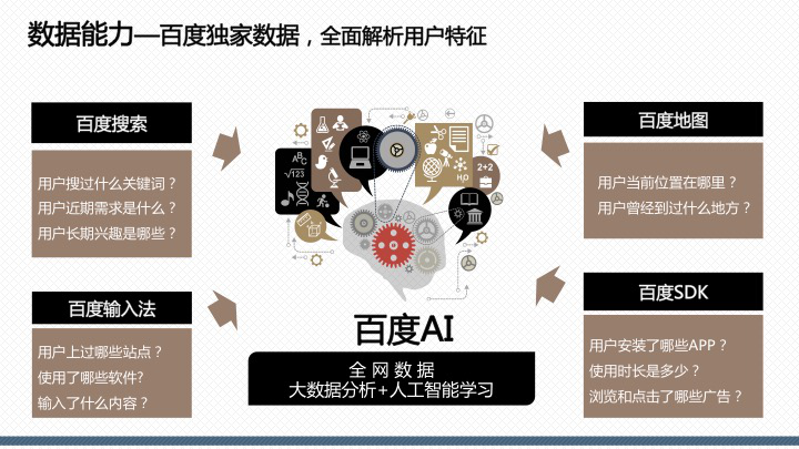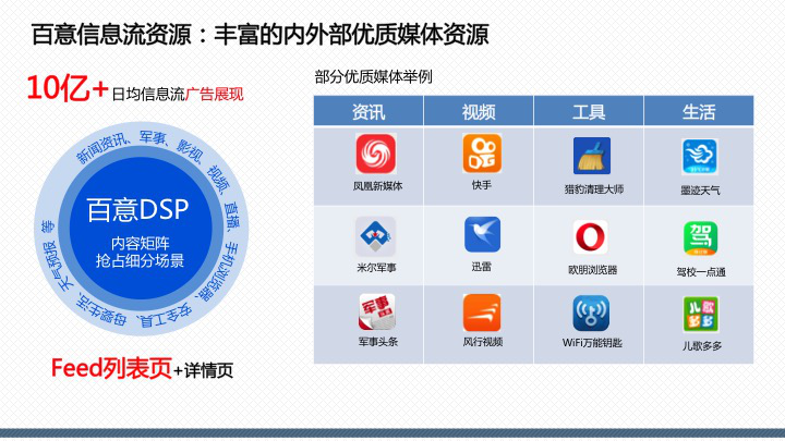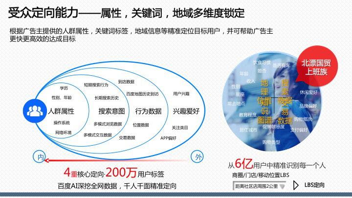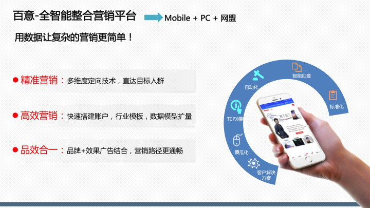 百度百意:提供品效合一的跨屏、全能、程序化投放服務囊括60萬家網站、app聯(lián)盟資源,橫跨PC、移動、交通、電視多屏呈現(xiàn),整合多維精準定向能力,千人千面時代,目標客戶咫尺觸達。